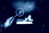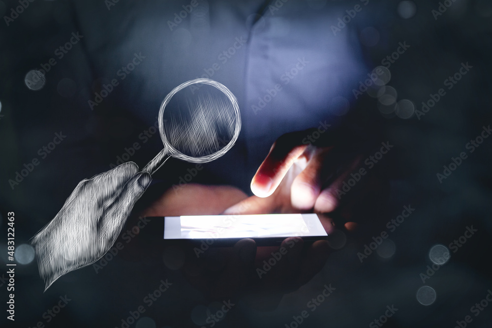 hand-drawn hand holding a magnifying glass. hand holding phone