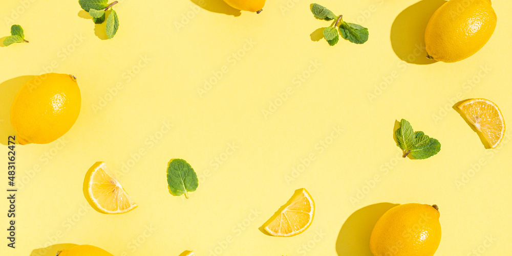 Fresh yellow lemons with mint on minimal beige yellow background on bright sun light with hard shadows pattern summer background flat lay from above, citrus food composition, space for text