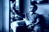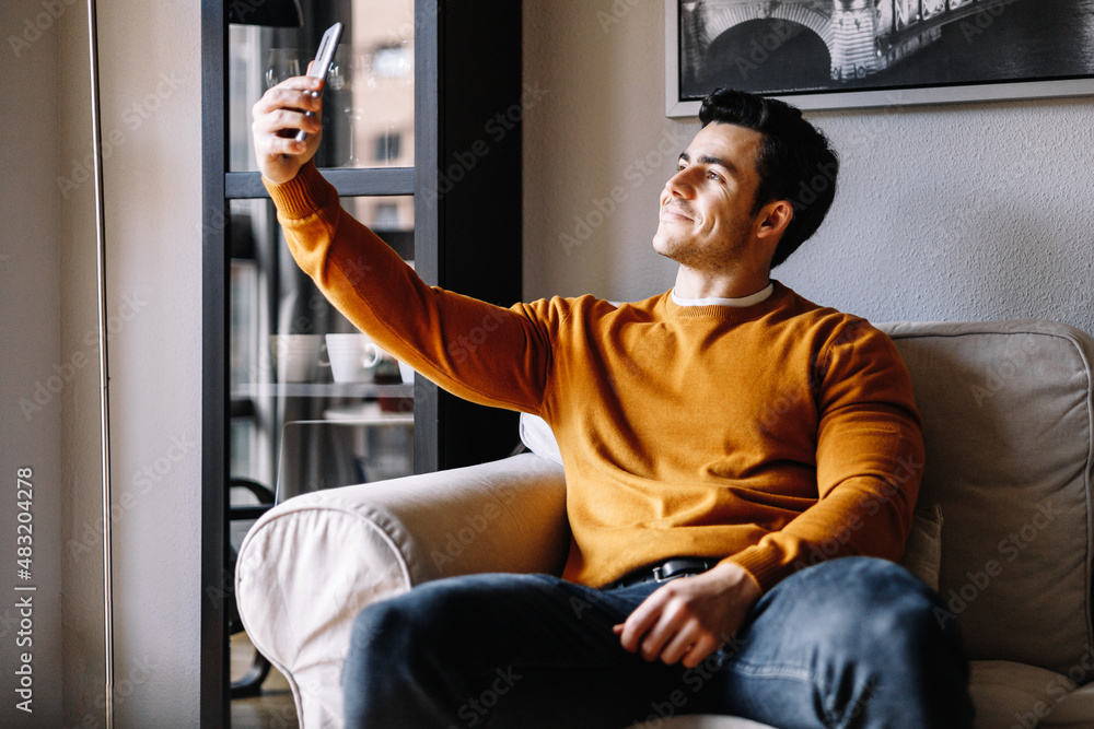 Attractive Hispanic young man taking pictures of himself in the living room wearing a casual outfit