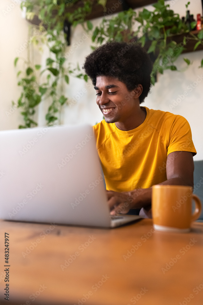 Happy young African American man sitting on sofa using laptop in the morning to check his social media. Vertical image.