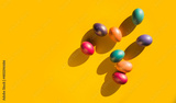 Happy Easter holiday concept. Set of handmade colorful eggs isolated on yellow background with shadow. Simple trendy minimal composition, flat lay, top view, copy space, place for text, banner