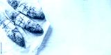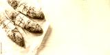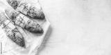 Top view of fresh breads on a white linen cloth on one thirdof the picture