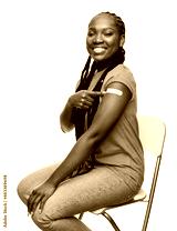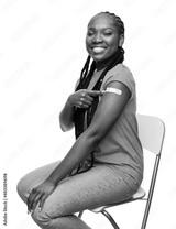 pandemic, vaccination and healthcare concept - happy young vaccinated woman with medical patch on shoulder sitting on chair over white background