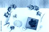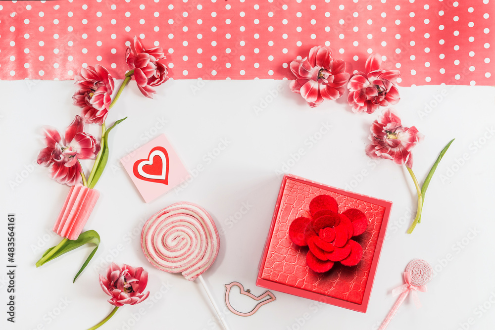 Romantic Valentines day background with hearts , red flowers, lollipop, gift box and greeting card with on white background. Top view. Frame