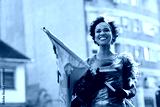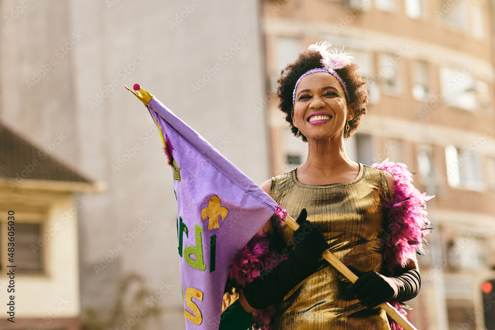 Cheerful black woman in carnival costume and make-up during Mardi Gras street parade.