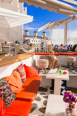 Mykonos island,Cyclades. Greece summer holidays. Bars by the sea in famous popular place "Little Venice".