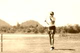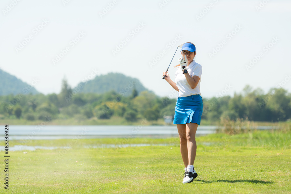 Golfer sport course golf ball fairway. People lifestyle woman relax after swing golf ball on the green. Asia female player game shot in summer. Healthy and Sport outdoor