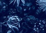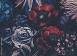 Moody dark close-up of blue and purple garden flowers. Floral pattern