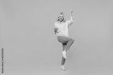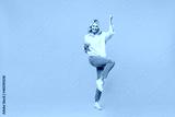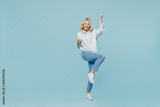 Full body overjoyed elderly woman 50s in casual striped shirt do winner gesture clench fist raise up leg isolated on plain pastel light blue color background studio portrait. People lifestyle concept.