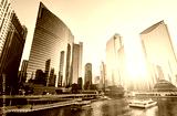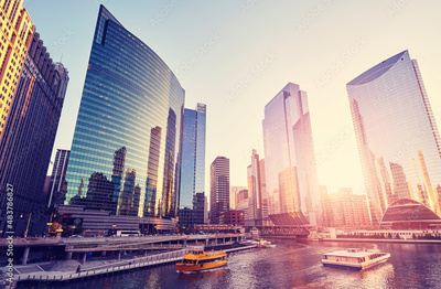 Downtown Chicago panorama at sunset, color toning applied, USA.