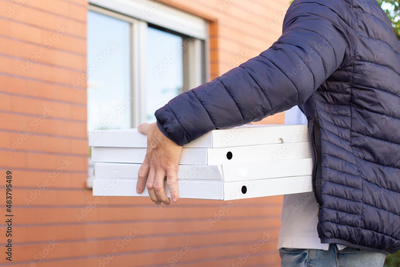 Close-up of stack of pizza boxes. Man dark blue coat delivering food on summer day. Work, service, shipment concept