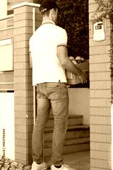Back view of mid adult deliveryman with products entering yard. Man in cap and white T-shirt delivering food, standing at door. Work, service, shipment concept