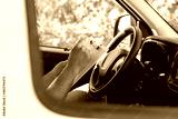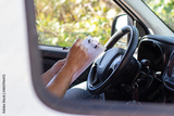 Close-up of deliveryman checking documents in car. Mans hands holding black pen and papers against steering wheel. Work, delivery service, shipment concept