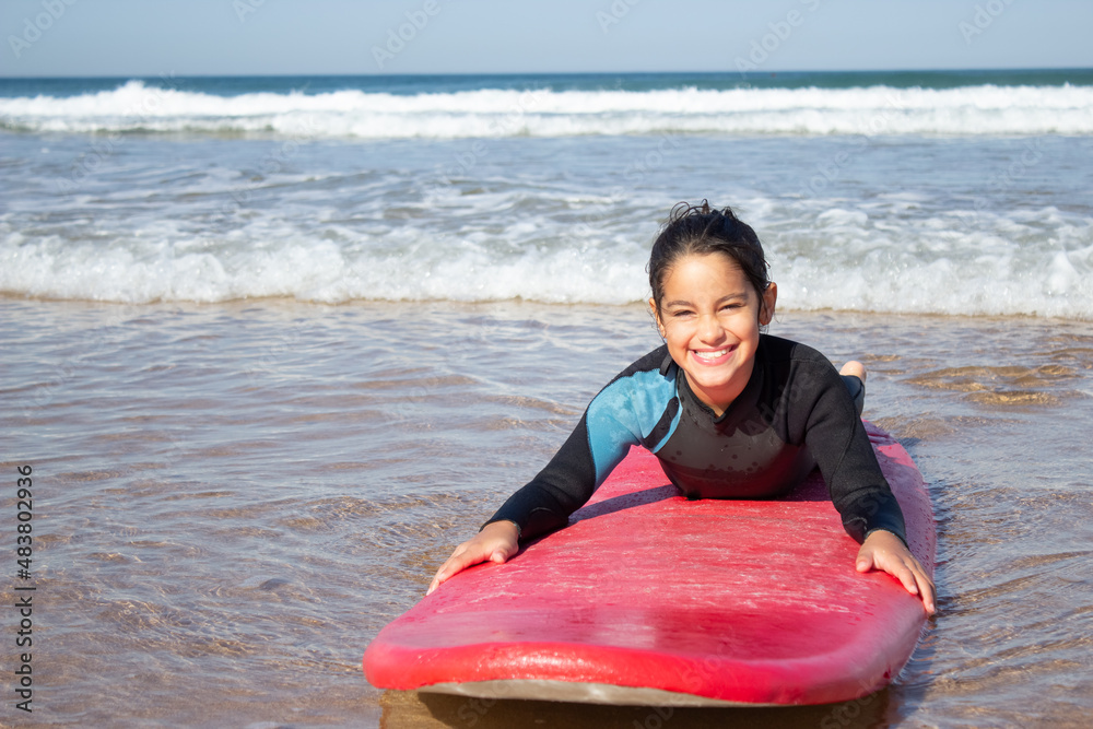 Portrait of sporty little girl on beach. Dark-haired child in surf uniform lying on surfboard on cloudy day. Waves in background. Family, leisure, active lifestyle concept