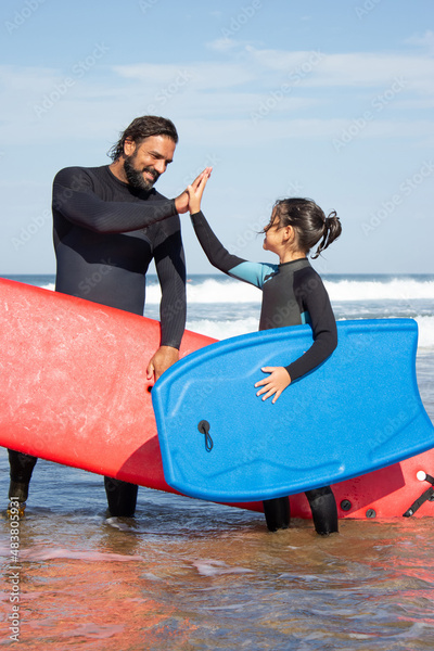 Jolly father and daughter doing sports on cloudy beach. Mid adult man with mechanical leg and dark-haired girl standing near water, giving high five. Family, leisure, active lifestyle concept