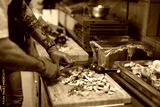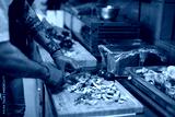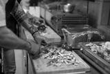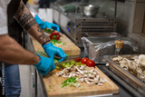 Unrecognizable chef with gloves cutting vegetables indoors in restaurant kitchen.