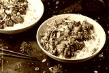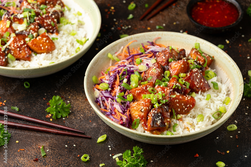 Vegan fried tempeh with rice and vegetables. Asian healthy food