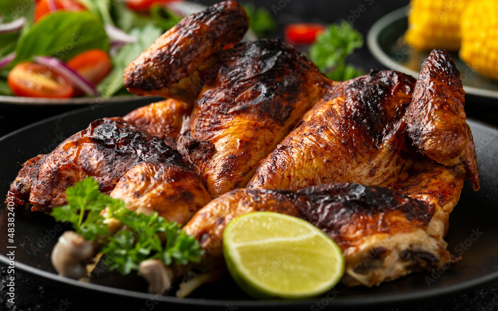 Roast Chicken Tabaka with salad, corn and lime on black plate.