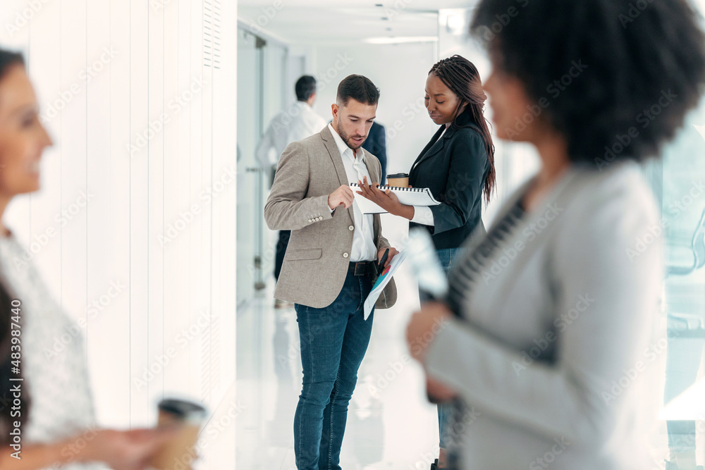 Elegant business people working with digital tablet while discussing together in a modern startup.