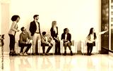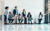 Successful business multiage team posing and looking at camera of smartphone in a modern startup.
