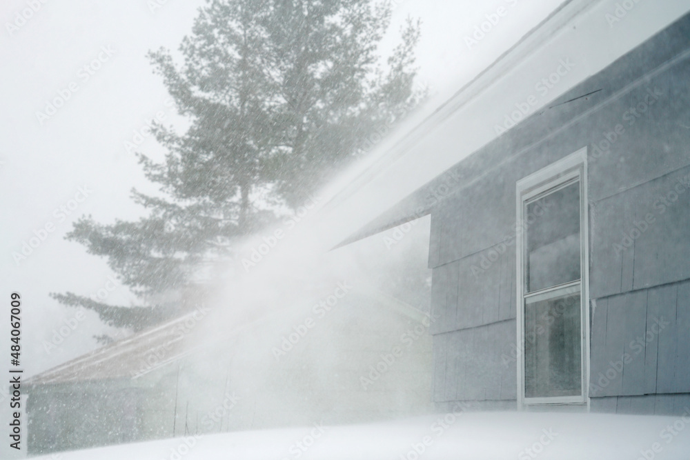 strong wind blowing snow off the roof in blizzard
