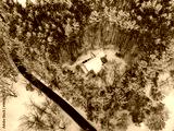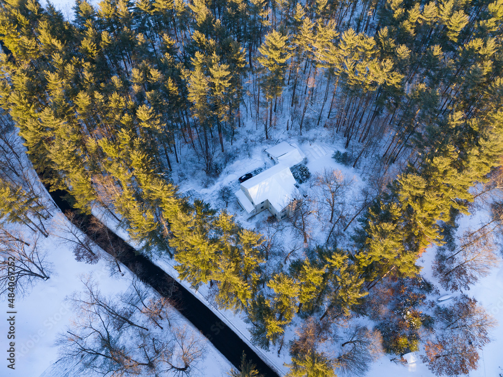 aerial view of house in woods after snow storm under sunlight