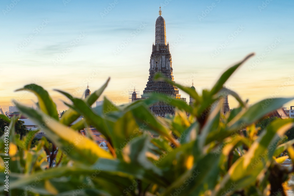 Wat Arun and Chao Phraya River with beautiful sunset sky background, Bangkok, Thailand