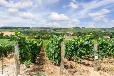 In the Champagne vineyards of Montagne de Reims, Reims, France, row vine grapes.