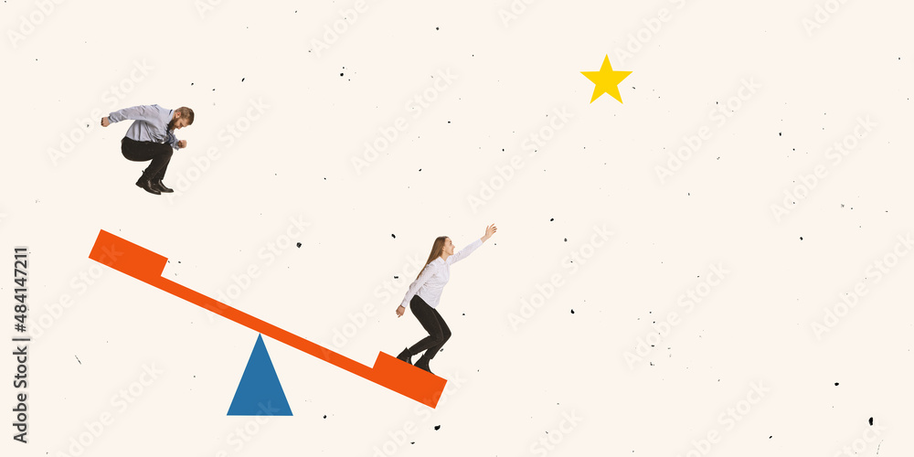 Creative design. Contemporary art collage. Businessman helping employee to reach the star of success