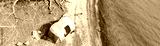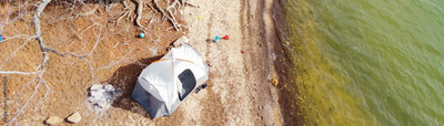 Panoramic top view large family tent and kids sand toys near rocky shoreline along Grapevine Lake, Texas, USA