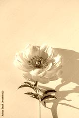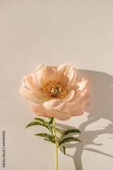 Delicate beige peony flower with sunlight shadows on neutral white background