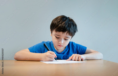 School kid using black pen drawing or writing the letter on paper, Young boy doing homework, Child with pen writing notes in paper sheet during the lesson.Cute pupil doing test, Homeschooling concept