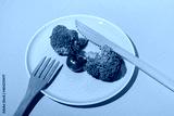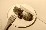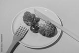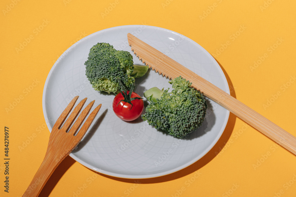 One small red cherry tomato and broccoli on a plate and bamboo fork and knife on a yellow background
