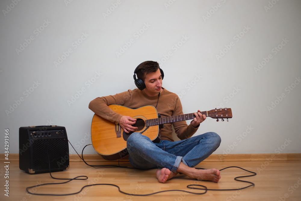 Young man playing on a guitar with wall on the background