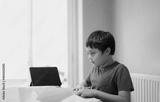Happy school Kid learning paper art origami lesson, Child boy having fun doing Art and Craft at home, Home schooling concept