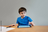 School Kid learning online class room at home, Child using tablet for homework, Young boy studying online video call, E-learning or Homeschooling education concept
