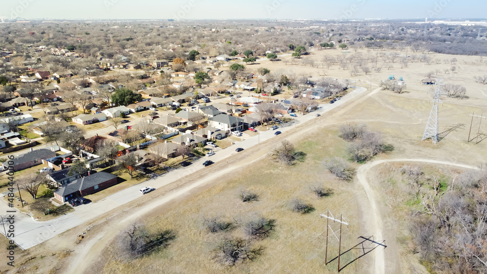 Aerial view residential neighborhood near park with power pylon transmission tower suburbs Dallas, Texas, USA