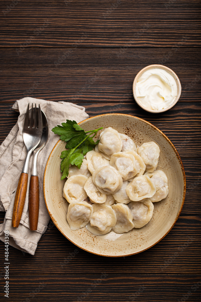 Pelmeni, traditional dish of Russian cuisine, boiled dumplings with minced meat filling on plate with sour cream sauce on wooden rustic background table from above food composition