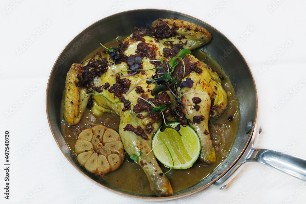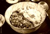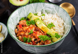 Chili con carne and couscous in bowl on dark background. Mexican cuisine.