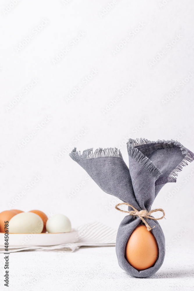 Easter egg decorated with a napkin in the shape of a bunny on a white concrete background