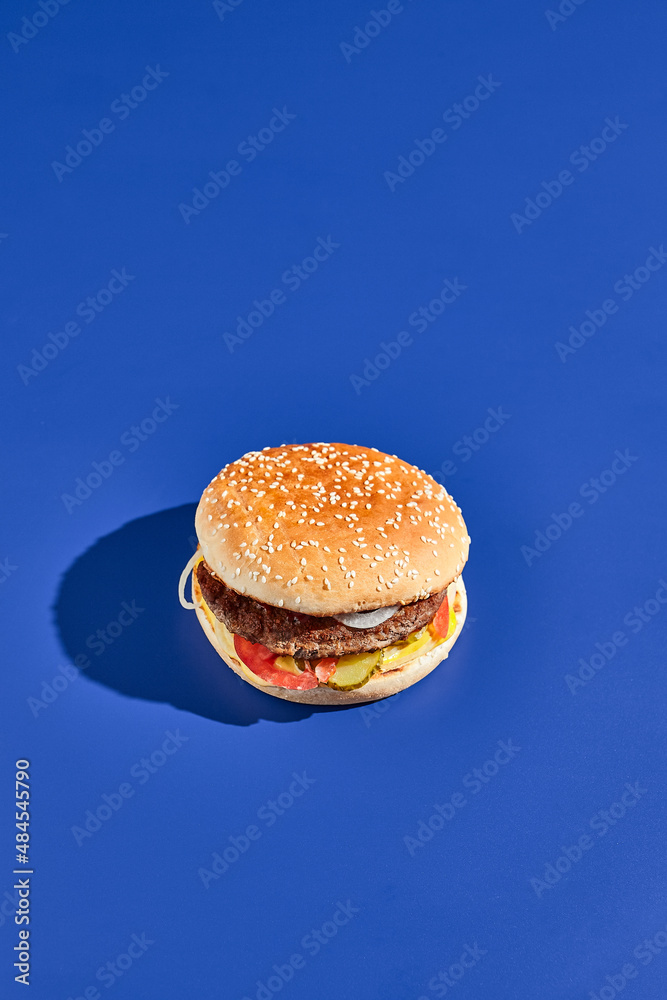 Beef burger blue background with hard shadow. American junk food minimal style. Hamburger trendy style. Simple burger colour background.