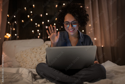 technology, bedtime and rest concept - happy smiling woman in pajamas with laptop computer sitting in bed at night and having video call