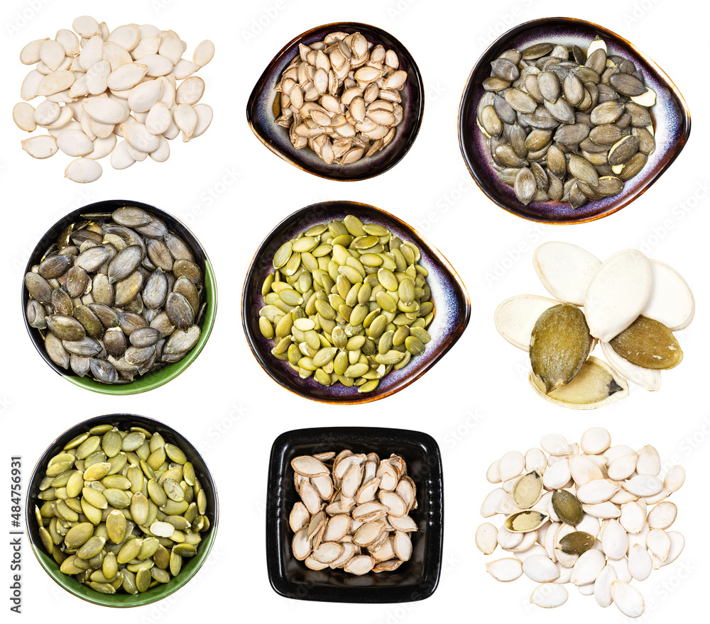 set of various pumpkin seeds isolated on white