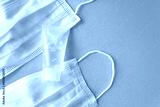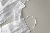 Flatlay alcohol gel liquid transparent small plastic tube bottle for medical purpose Protect coronavirus COVID-19 (Ethanol or ethyl alcohol) with two white surgical mask background. Healthcare concept