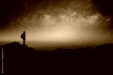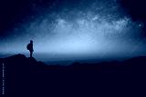 Silhouette of young male traveler with backpack standing and watching the star, milky way over the sky alone on top of the mountain. He enjoyed traveling and was successful when he reached the summit.