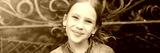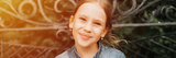 portrait happy smiling candid eight year old kid girl face sits on bench in nature. prepubertal age of children and lives, mind psychology and mental health. geometric shapes. banner. flare
