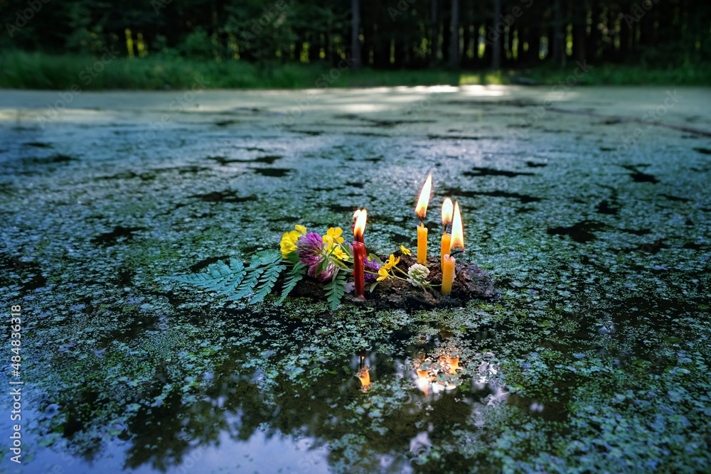 flowers and burning candles on dark water, covered aquatic plants duckweeds (Lemna). old tradition, fortune telling for pagan holiday. Summer Solstice Day, Midsummer, wicca, Litha sabbat
