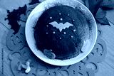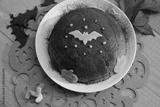 Chocolate cake for Halloween decorated with sugar bats and pumpkins on a plate on wooden table