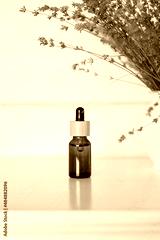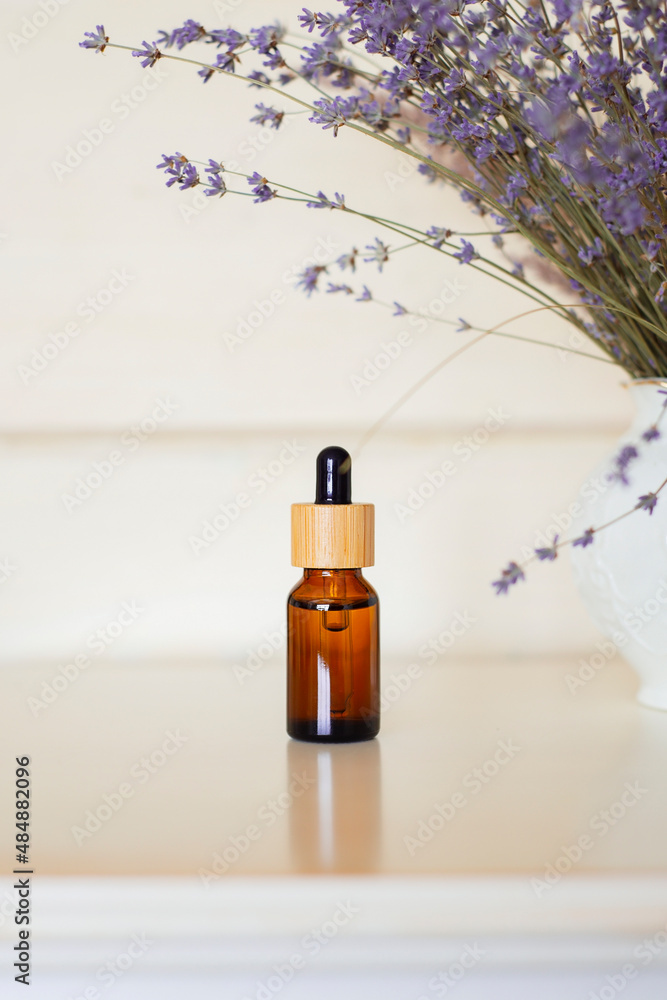 Amber glass bottles with dropper pipette with serum or essential oil on the on a nightstand with lavender flowers. Skin care products , natural cosmetic. Beauty concept for face and body care