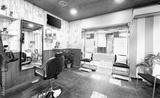 Vintage beauty salon. Hair salon interior business with retro organic minimal look. Wooden decoration with wood panels, raw wall with bricks, mirrors, chairs,tv screen and mockup banners
